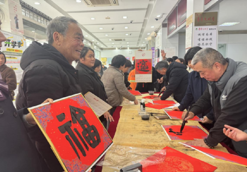 一副副红纸黑字,不仅增添了节日的喜庆,也让金融厅堂里流淌起文化的温度。