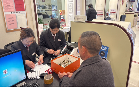 稠州银行丽水云和凤凰支行的大厅里走进一位抱着沉甸甸纸箱的大伯。箱子里是家中经营小卖部积攒下的2000余枚硬币,从1元、5角到1角,甚至还有不少残损的小面额纸币。面对这一大箱“甜蜜的负担”,大伯面露难色。